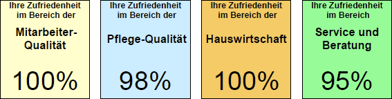 Gerade was die Qualität der Mitarbeiter anbelangt, können wir ein besonders gutes Ergebnis vorweisen, dieser Bereich wurde von Ihnen zu 100% positiv bewertet. Der Bereich "Qualität der Hauswirtschaft" wurde von Ihnen ebenfalls mit 100%iger Zufriedenheit und der Bereich "Qualität der Pflege" mit einer 98%igen Zufriedenheit ausgezeichnet.